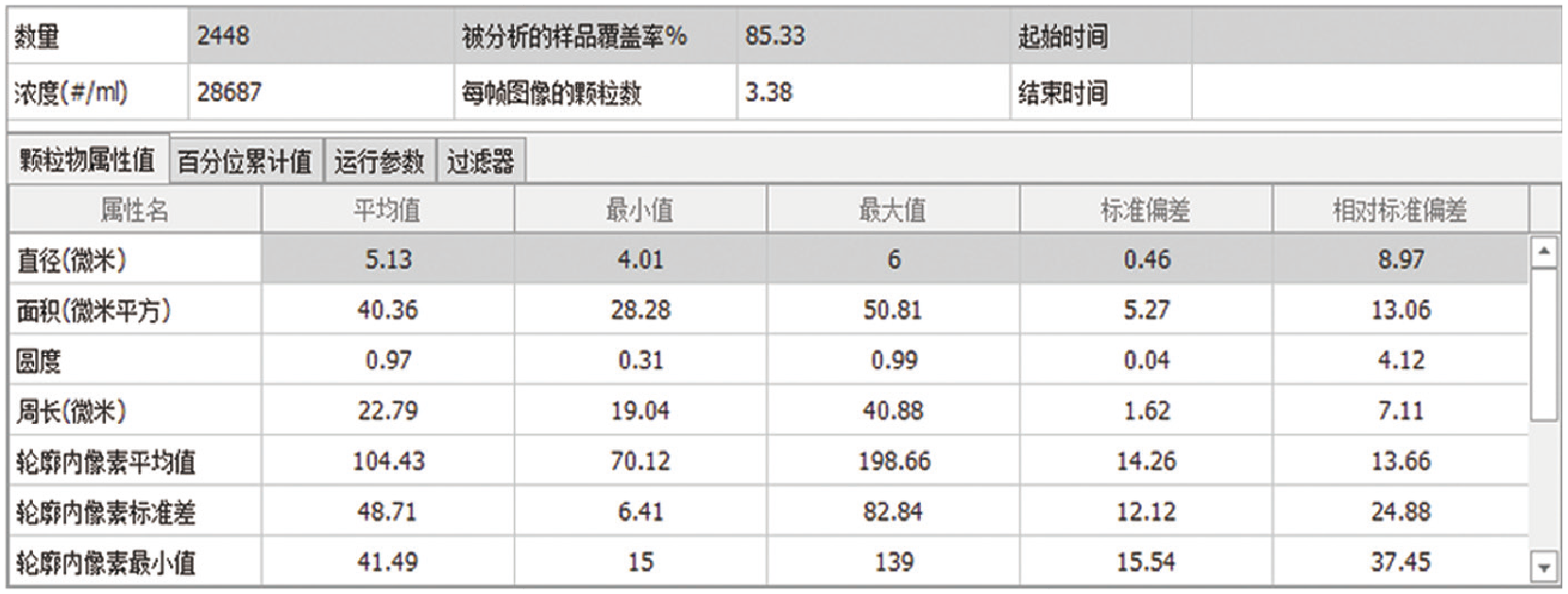 | 形态学参数 | 形态学参数有等效ECD、面积、周长、像素平均值、像素STD、像素最大值、像素最小值、凸度、紧凑度、伸长率、粗糙度、纵横比、最大弗雷特直径、对称度、透明、离心率、圆度 |