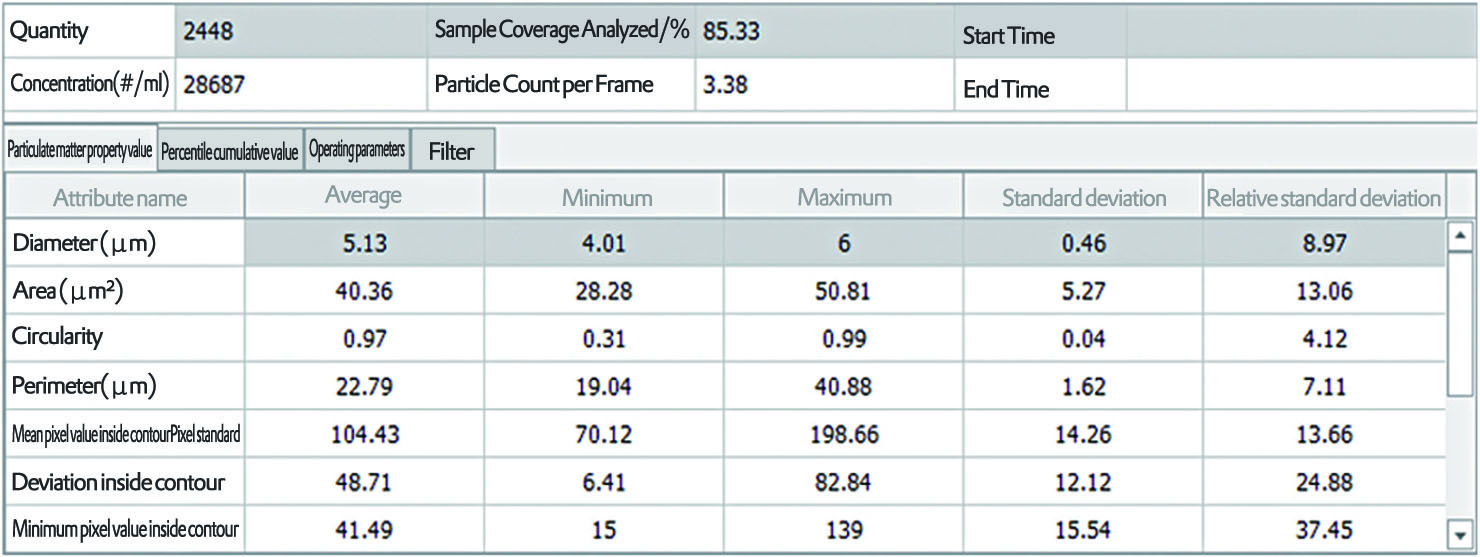 | Morphological Parameters | Morphological parameters include equivalent ECD, area, perimeter, average pixel value, pixel STD, maximum pixel value, minimum pixel value, convexity, compactness, elongation, roughness, aspect ratio, maximum Fret diameter, symmetry, transparency, eccentricity, roundness |